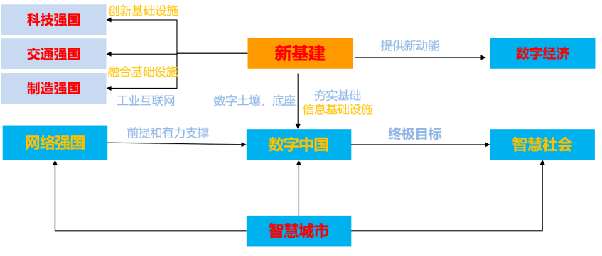 黨的十九大報(bào)告中提出“要建設(shè)科技強(qiáng)國(guó)、質(zhì)量強(qiáng)國(guó)、航天強(qiáng)國(guó)、網(wǎng)絡(luò)強(qiáng)國(guó)、交通強(qiáng)國(guó)、數(shù)字中國(guó)和智慧社會(huì)”的國(guó)家戰(zhàn)略。新基建以數(shù)字化為核心,對(duì)傳統(tǒng)基礎(chǔ)設(shè)施進(jìn)行數(shù)字化、智能化改造,實(shí)現(xiàn)傳統(tǒng)基礎(chǔ)設(shè)施轉(zhuǎn)型升級(jí),滿足智能時(shí)代發(fā)展對(duì)基礎(chǔ)設(shè)施的要求,與“數(shù)字中國(guó)”戰(zhàn)略一脈相承,為數(shù)字中國(guó)發(fā)展補(bǔ)齊短板。